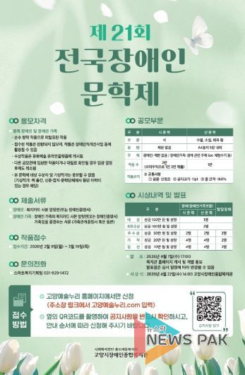 뉴스팍 배상미 기자 | 고양시장애인종합복지관은 3월 19일까지 전국의 장애인 및 장애인 가족을 대상으로 ‘제21회 전국장애인문학제’ 작품 접수를 진행한다.