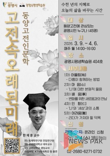 뉴스팍 배상미 기자 | 광명시 평생학습원은 오는 3월 9일부터 운영되는 광명지식상점 기획 강좌 ‘동양고전인문학: 인공지능(AI) 시대, 고전 속 오래된 미래’에 참여할 시민 40명을 모집한다.