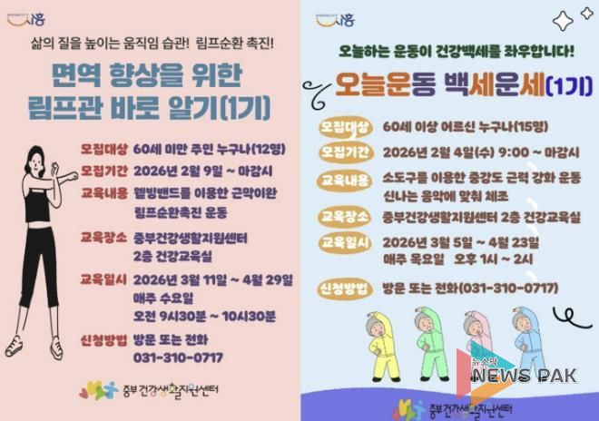 뉴스팍 배상미 기자 | 시흥시보건소 중부건강생활지원센터에서는 일상 속 움직임이 쌓여 내일의 건강한 삶으로 이어질 수 있도록, 지역주민 대상 신체활동 프로그램 ‘오늘 운동 백세 운세’와 ‘면역 향상을 위한 림프관 바로 알기’를 운영한다.