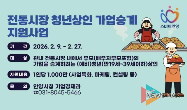 뉴스팍 배상미 기자 | 안양시가 전통시장에 젊은 활력을 불어넣고 청년 상인의 안정적인 정착을 돕기 위해 ‘2026년 전통시장 청년상인 가업승계 지원사업’을 추진한다고 13일 밝혔다.