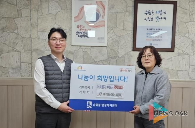 뉴스팍 배상미 기자 | 수원시 장안구 송죽동 행정복지센터는 ㈜엑티브아이티에서 지난 12일, 설 명절을 맞아 취약계층을 위한 후원금을 기탁했다고 밝혔다.