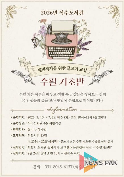 뉴스팍 배상미 기자 | 안양시 석수도서관은 문학과 글쓰기에 관심 있는 안양 시민을 대상으로 ‘예비작가를 위한 글쓰기 교실’ 수필 기초반 및 소설 창작반을 운영한다고 13일 밝혔다.