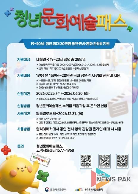 신청은 2월 25일부터 6월 30일까지로 청년문화예술패스 누리집에서 가능하며, 발급된 포인트는 올해 말까지 사용할 수 있다. 다만 7월 31일까지 사용 이력이 없는 경우 지원금이 회수되며 재신청이 불가하다. 상세 내용은 공식 누리집에서 확인할 수 있다.