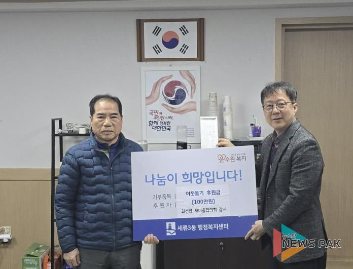 뉴스팍 배상미 기자 | 권선구 세류3동 행정복지센터는 지난 19일, 최선집 세류3동 통장협의회 부회장(겸 새마을지도자협의회 감사)이 어려운 이웃을 위해 써달라며 성금 100만 원을 기부했다고 전했다.