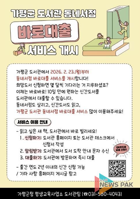 뉴스팍 배상미 기자 | 가평군이 도서관에 없는 도서에 대해 구입부터 대출까지 걸리던 시간을 획기적으로 줄이고, 도서 공급처를 관내 영세 동네서점으로 전환하는 상생형 서비스에 나섰다.