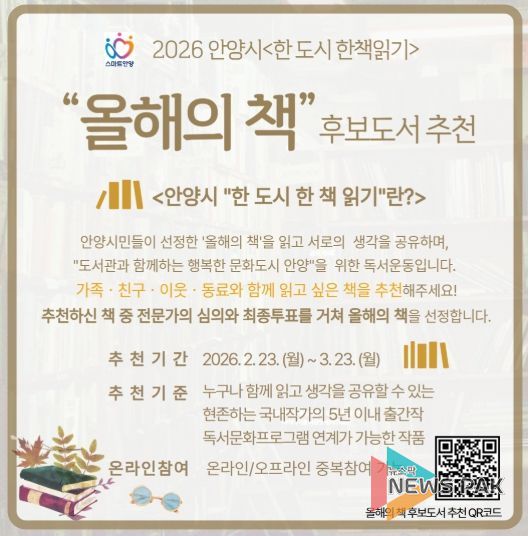 뉴스팍 배상미 기자 | 안양시는 시민과 함께 성장하는 독서 공동체를 만들기 위해 내달 23일까지‘2026년 안양시 올해의 책 후보 도서를 추천받는다고 23일 밝혔다.
