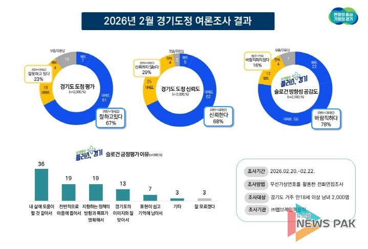 경기도가 ㈜엠브레인퍼블릭에 의뢰해 2월 20일부터 22일까지 실시한 정기 여론조사 결과, 경기도정에 대해 “잘하고 있다”는 응답은 67%, “잘못하고 있다”는 23%, “모름·무응답”은 10%였다.