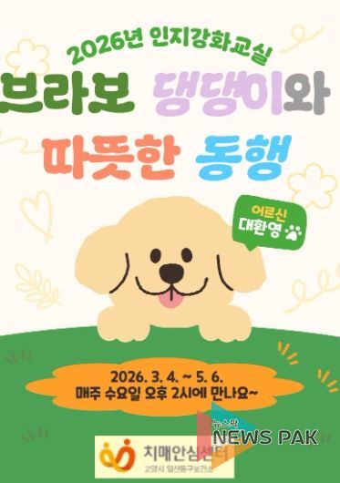 뉴스팍 배상미 기자 | 고양특례시 일산동구보건소 치매안심센터는 중앙치매센터에서 개발한 ‘BRABO’ 인지훈련 프로그램과 동물교감치료를 적용한 ‘브라보 댕댕이와 따뜻한 동행’ 프로그램의 참가자를 모집한다고 26일 밝혔다.