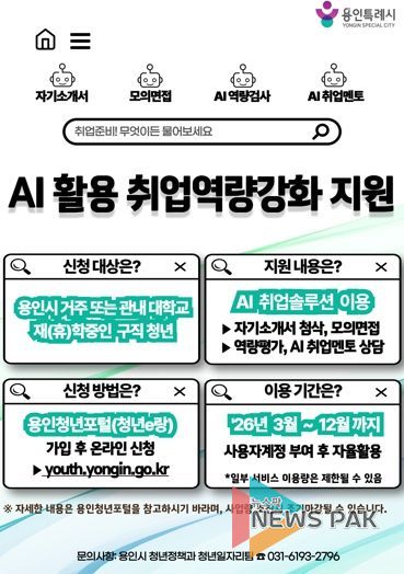 뉴스팍 배상미 기자 | 용인특례시는 인공지능(AI)을 활용한 취업역량강화 지원사업에 참여할 청년 구직자를 모집한다고 2일 밝혔다.