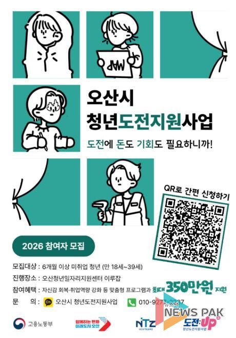 뉴스팍 이소율 기자 | 오산시는 구직에 어려움을 겪는 청년들의 자신감 회복과 성공적인 사회 진출을 지원하기 위해 ‘2026년 청년도전지원사업’ 참여자를 3월간 집중 모집한다고 밝혔다.