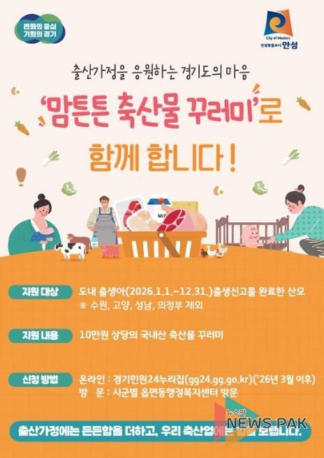 뉴스팍 배상미 기자 | 안성시는 저출산 시대 출산 산모의 건강 회복과 위축된 축산업 소득 증대를 위해 2026년에 출산한 산모를 대상으로 ‘맘튼튼 축산물 꾸러미 지원사업’을 3월 9일 10시부터 시행한다고 밝혔다.
