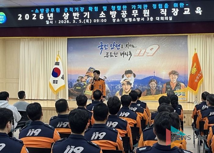 뉴스팍 배상미 기자 | 광명소방서는 5일 본서 3층 대회의실에서 전 직원을 대상으로 2026년 상반기 소방공무원 직장교육을 실시했다.