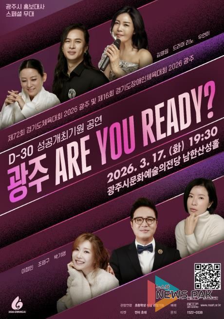 뉴스팍 이화형 기자 | 광주시문화재단은 오는 17일 ‘제72회 경기도체육대회 및 제16회 경기도장애인체육대회 2026 광주’의 성공 개최를 기원하고 대회 개막 30일 전을 기념하는 ‘광주 ARE YOU READY?’ 공연을 개최한다고 6일 밝혔다.