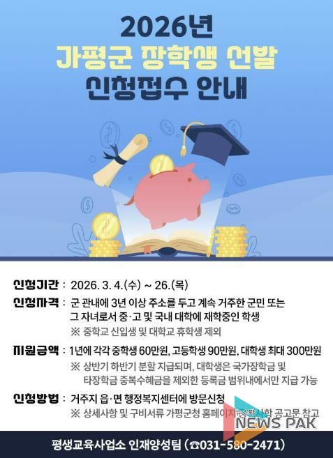 뉴스팍 배상미 기자 | 가평군이 지역 학생들의 균등한 교육 기회를 보장하고 우수 인재를 육성하기 위해 2026년도 장학생 선발에 나선다.