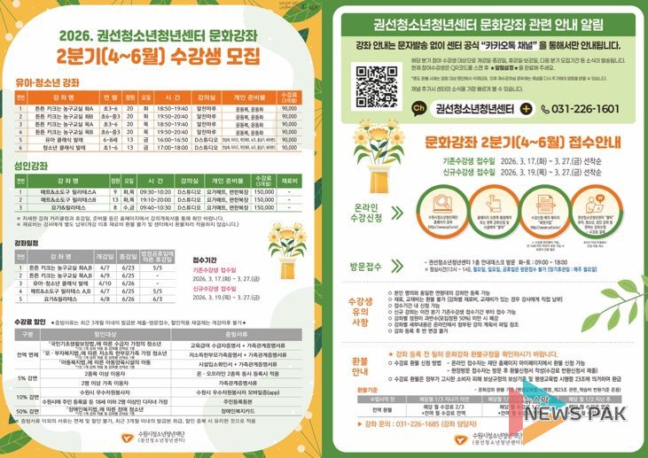 뉴스팍 배상미 기자 | 수원시청소년청년재단 권선청소년청년센터는 오는 3월 17일부터 3월 27일까지 지역사회 평생학습 문화강좌 2분기(4~6월) 수강생을 모집한다.