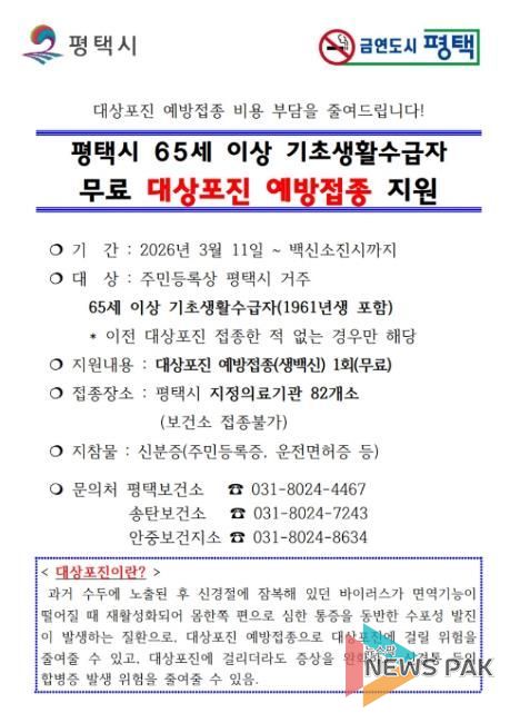 뉴스팍 이소율 기자 | 평택시는 65세 이상 취약계층 어르신의 건강증진과 예방접종 비용 부담 완화를 위해 ‘대상포진 예방접종을 연중 무료로 지원’한다고 밝혔다.