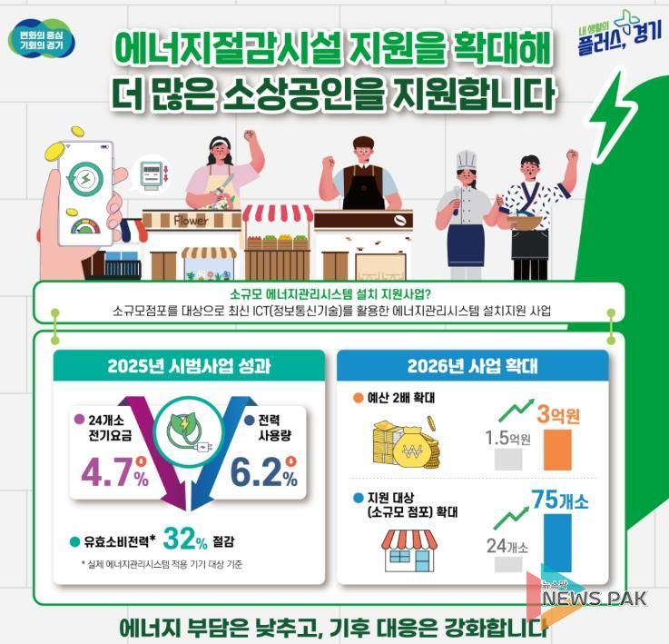 차성수 경기도 기후환경에너지국장은 “2025년 시범사업에서 전기요금 절감 효과가 객관적으로 입증된 만큼 2026년에는 보다 많은 소상공인이 혜택을 받을 수 있도록 사업을 확대 추진한다”며 “에너지 효율 향상을 통해 소상공인의 경쟁력을 높이고, 기후위기 대응에도 앞장서겠다”고 말했다.