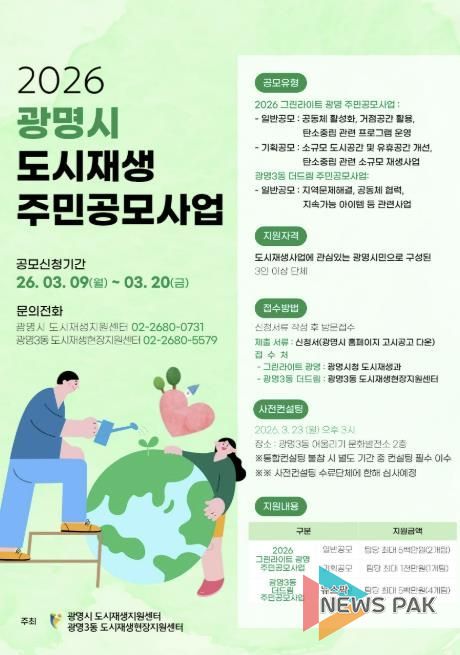 뉴스팍 배상미 기자 | 광명시가 오는 20일까지 주민이 스스로 마을 문제를 해결하고 공동체 활성화를 이끌어갈 ‘2026년 도시재생 주민공모사업’ 참여단체를 모집한다.