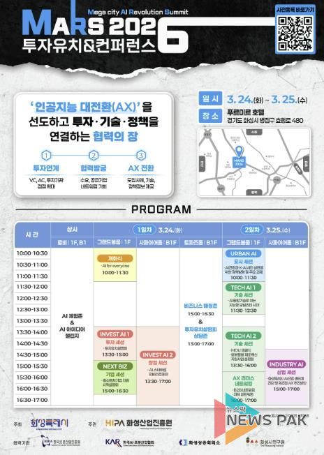 뉴스팍 류은정 기자 | 화성특례시가 오는 3월 24일부터 25일까지 이틀간 푸르미르 호텔에서 'MARS 2026 투자유치 & 컨퍼런스'를 개최한다.