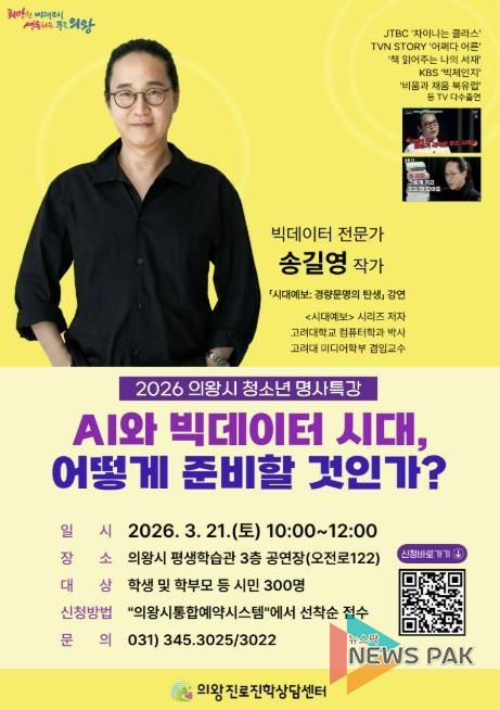 뉴스팍 배상미 기자 | 의왕시 진로진학상담센터가 3월 21일 오전 10시, 의왕시 평생학습관(오전로 122)에서 청소년과 시민을 대상으로 '2026 상반기 청소년 명사특강'을 개최한다.