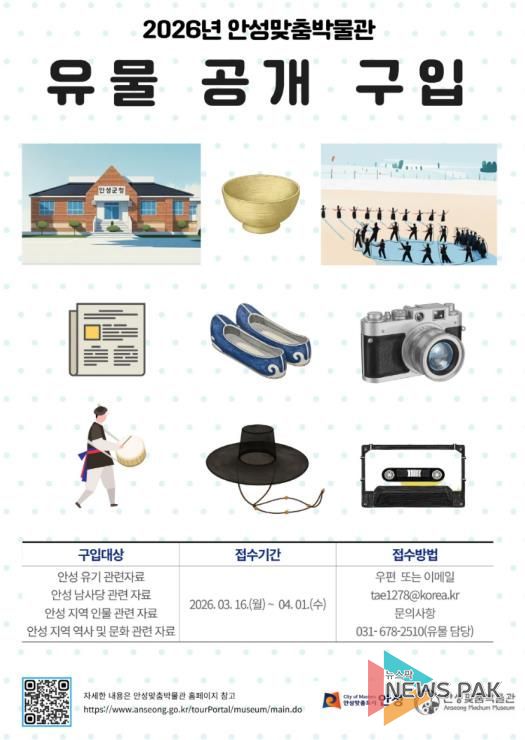 뉴스팍 배상미 기자 | 안성시 안성맞춤박물관은 오는 3월 16일부터 전시․학술․교육자료 수집을 위한 유물 공개 구입을 추진한다고 밝혔다.