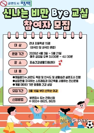 뉴스팍 이소율 기자 | 평택시 포승건강생활지원센터에서는 외국인 학생을 포함한 초등학생들을 대상으로 ‘몸도 튼튼! 우정도 쑥쑥! 신나는 비만 Bye 교실’ 참여자를 모집한다고 밝혔다.