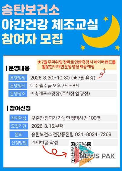 뉴스팍 이소율 기자 | 평택시는 시민의 건강증진과 규칙적인 신체활동 실천을 돕기 위해 ‘2026년 송탄보건소 야간건강 체조교실’을 운영한다.