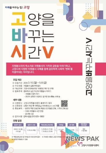 뉴스팍 배상미 기자 | 고양시자원봉사센터는 3월 16일부터 5월 8일까지 자원봉사 감동사례 발표회 ‘2026 고양을 바꾸는 시간 : 고바시V’에 참여할 발표자를 모집한다.