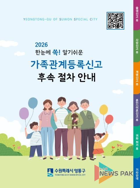 뉴스팍 배상미 기자 | 수원시 영통구는 시민들이 가족관계등록신고 후 필요한 후속절차와 복지혜택을 한눈에 확인할 수 있도록 안내 책자 3,000부를 제작해 구청과 동 민원실, 영통구보건소 등에 배부한다.
