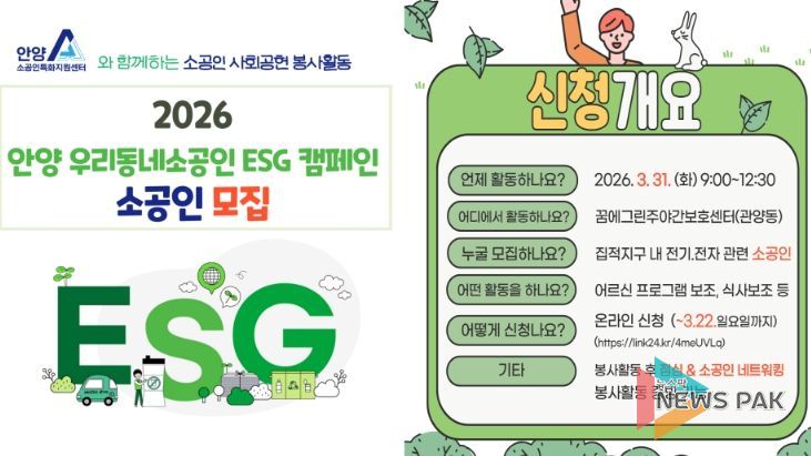 뉴스팍 배상미 기자 | 안양산업진흥원은 오는 22일까지 소공인지원센터의 소공인 사회공헌 프로그램인 ‘2026 안양 우리동네소공인 ESG 캠페인’에 참여할 관내 소공인을 모집한다고 18일 밝혔다.