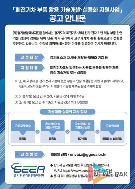 뉴스팍 배상미 기자 | 경기환경에너지진흥원은 4월 7일까지 ‘2026년 폐전기차 부품 활용 기술개발 및 실증화 지원사업’에 참여할 기업을 모집한다.