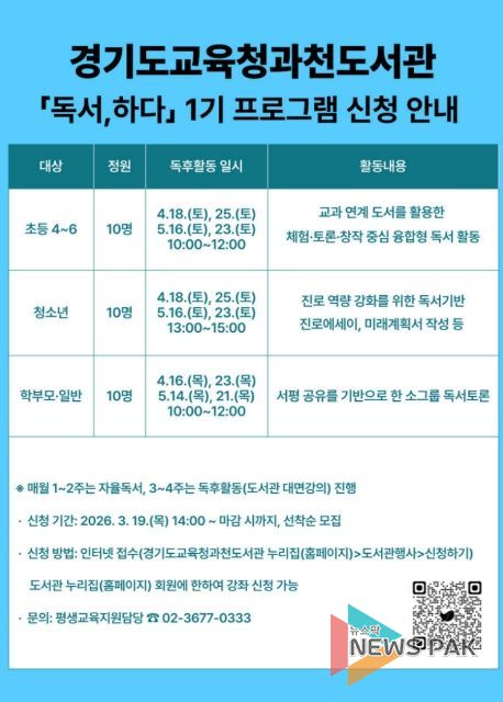뉴스팍 배상미 기자 | 경기도교육청과천도서관이 지역주민의 독서 역량 강화와 융합적 사고력 함양을 위해 '2026년 독서, 하다’프로그램을 운영한다.