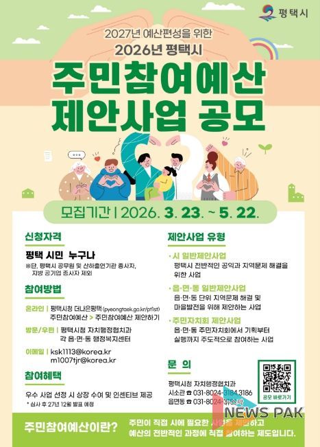 뉴스팍 이소율 기자 | 평택시가 3월 23일부터 5월 22일까지 2027년도 예산 편성을 위한 2026년도 주민참여예산 제안사업 공모를 시행한다.