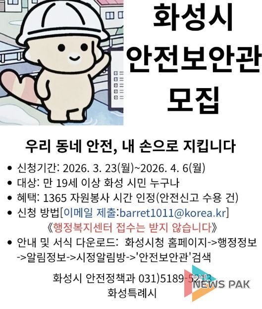 뉴스팍 류은정 기자 | 화성특례시는 지역 내 안전문화 확산과 생활 속 위험요소의 사전 발굴·제거를 위해 안전보안관 145명을 공개 모집한다고 23일 밝혔다.