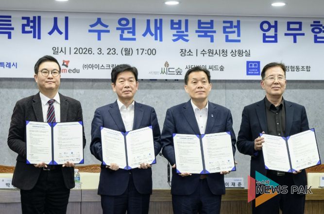 수원시와 ㈜아이스크림에듀, (사)씨드(Seed)숲, 수원시서점협동조합은 23일 시청 상황실에서 ‘수원새빛북런(Book Learn) 업무협약’을 체결하고, 협력을 약속했다.