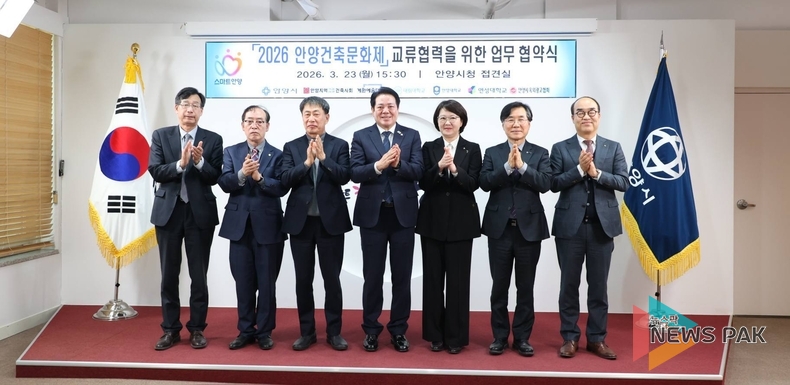 뉴스팍 배상미 기자 | 안양시가 ‘건축이 아름다운 도시, 머물고 싶은 안양’을 만들기 위해 본격적인 행보에 나섰다. 안양시는 지난 23일, 시청 상황실에서 ‘2026 안양건축문화제’의 성공적인 추진과 상호 교류 협력을 위한 업무협약(MOU)을 체결했다고 밝혔다.