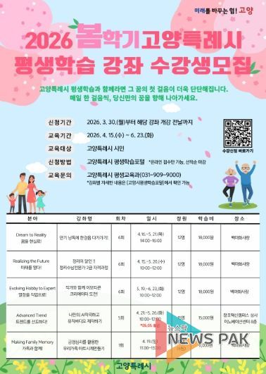 뉴스팍 배상미 기자 | 고양특례시는 2026년 봄학기 평생학습 강좌를 오는 4월 15일부터 본격적으로 운영한다.