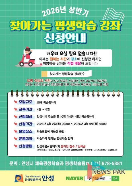 뉴스팍 배상미 기자 | 안성시는 시민이 원하는 시간과 장소에서 희망하는 강좌를 수강할 수 있는 '2026년 상반기 찾아가는 평생학습 강좌'를 운영한다고 밝혔다.