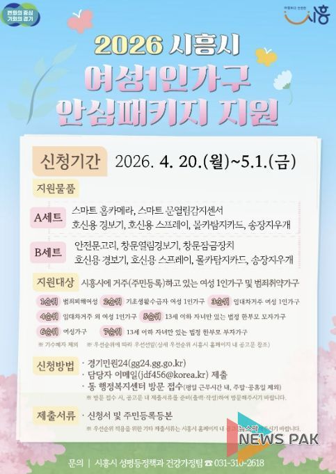 뉴스팍 배상미 기자 | 시흥시는 관내 여성 1인 가구 등의 안전한 일상 보호를 위해 ‘2026년 시흥시 여성 1인 가구 안심패키지 지원사업’을 추진하고, 오는 4월 20일부터 5월 1일까지 신청을 받는다.