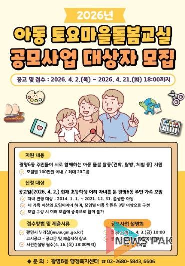 뉴스팍 배상미 기자 | 광명시 광명6동 행정복지센터는 오는 21일까지 ‘2026년 아동 토요마을돌봄교실 공모사업’에 참여할 주민 가족 모임 20개 팀을 모집한다.