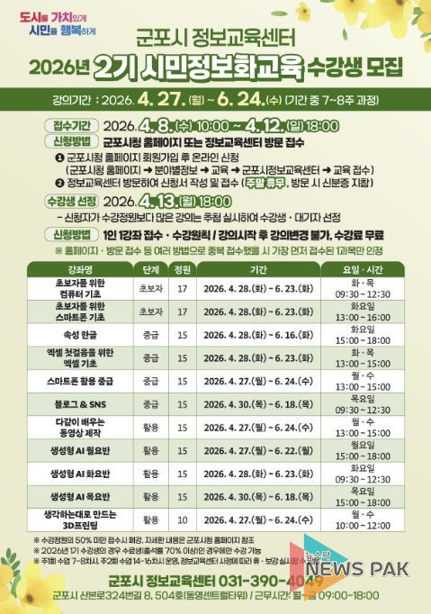 뉴스팍 배상미 기자 | 군포시는 시민들의 정보화 시대에 대한 적응 능력 향상 및 정보 소외 계층의 디지털 격차 해소를 위해 운영되는 ‘2026년 2기 시민정보화교육’의 수강생을 오는 4월 8일부터 4월 12일까지 모집한다고 밝혔다.