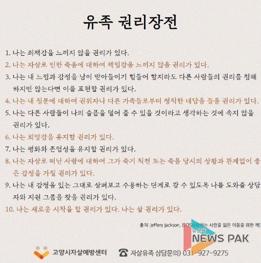 뉴스팍 배상미 기자 | 고양특례시 일산동구 고양시자살예방센터는 자살로 소중한 가족을 잃고 심리적 어려움을 겪고 있는 유족을 대상으로 자살유족 자조모임 ‘도담도담’을 운영하고 있다고 2일 밝혔다.