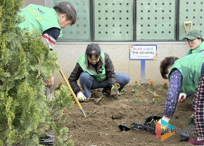뉴스팍 배상미 기자 | 수원시 팔달구 화서1동은 4월 3일, 새마을단체와 함께 '우리동네 새빛 새단장' 봄맞이 초화 식재를 진행했다. 이번 초화 식재는 완연한 봄을 맞아 화서1동 행정복지센터에 위치한 ‘행복정원’을 다채로운 봄꽃으로 단장하여 주민들에게 쾌적한 도시 경관과 화사한 볼거리를 제공하기 위해 추진됐다.