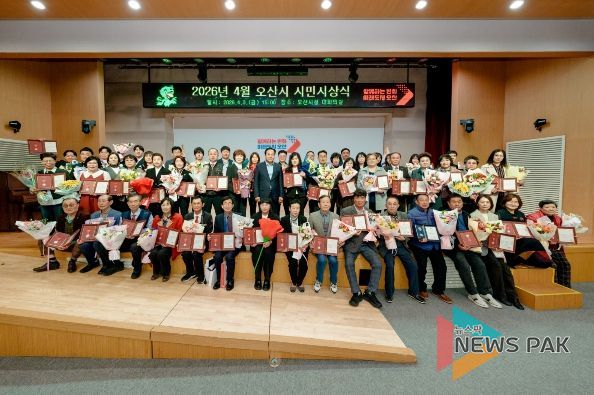 뉴스팍 이소율 기자 | 오산시는 지난 3일 오산시청 대회의실에서 ‘2026년 4월 시민시상식’을 개최하고 지역사회 발전과 시민 복지 증진에 기여한 유공자들을 표창했다고 밝혔다.