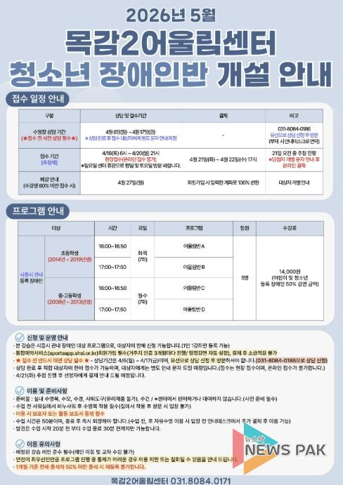 프로그램 접수는 4월 18일 6시부터 4월 20일 21시까지 현장 접수를 진행하고, 4월 21일 당첨자에게 개별 안내할 예정이다. 궁금한 사항은 목감2어울림센터로 문의하면 된다.