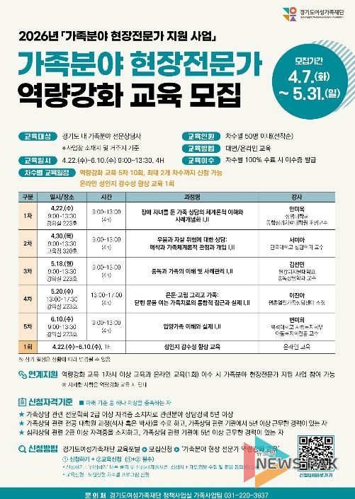 모집대상은 경기도 내 가족분야 전문상담사이며, 교육은 차수별 50명 내외로 총 5차에 걸쳐 운영된다. 신청기간은 4월 7일부터 5월 31일까지이며, 재단 누리집을 통해 차수별로 선착순 모집한다.