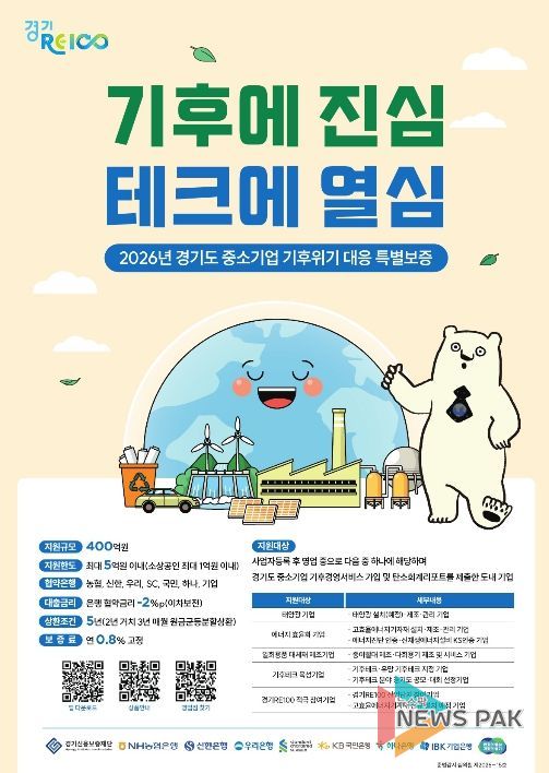 경기도는 도내 기업들의 저탄소 전환을 돕고 기후위기 대응 경쟁력을 근본적으로 강화하기 위해 ‘2026년 중소기업 기후위기 대응 특별보증’ 금융 지원을 본격 추진한다고 7일 밝혔다.