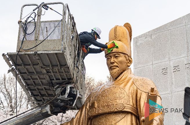 뉴스팍 배상미 기자 | 수원특례시가 봄을 맞아 6일 팔달산에 있는 정조대왕 동상을 세척하고, 주변 환경을 정비했다.
