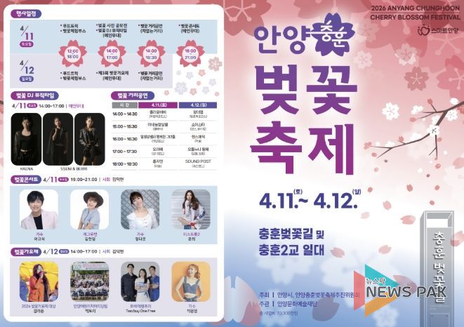 뉴스팍 배상미 기자 | 안양시는 오는 4월 11일부터 12일까지 이틀간 만안구 충훈동 충훈벚꽃길과 충훈2교 하부, 석수로 일대에서 ‘2026 안양충훈벚꽃축제’를 개최한다고 8일 밝혔다.