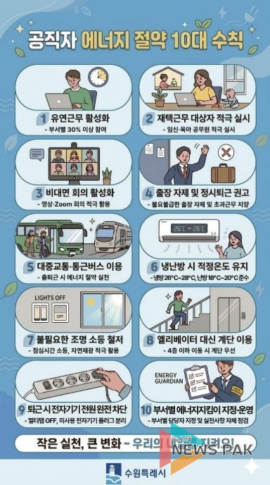 뉴스팍 배상미 기자 | 수원특례시가 ‘공직자 에너지 절약 10대 수칙’을 수립·시행해 중동 전쟁 장기화로 인한 에너지 수급 불안에 선제적으로 대응한다.